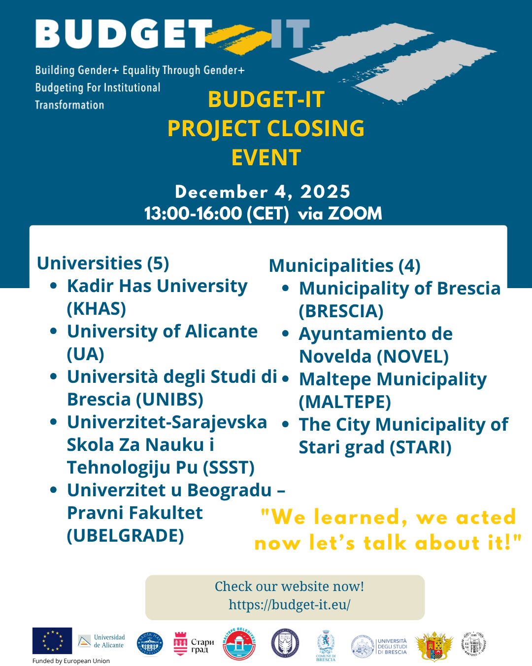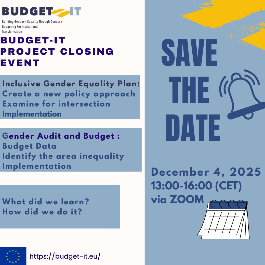 We are pleased to invite you to the Closing Event of the BUDGET-IT Project, where we will celebrate the achievements, share key outcomes, and reflect on the journey we’ve taken together. 📅 Date: December 4, 2025🕒 Time: 13:00-16:00 CET📍 Location: Online–ZOOM Over the course of the project, BUDGET-IT has aimed support gender equality through the development of gender+ equality plans and gender+…